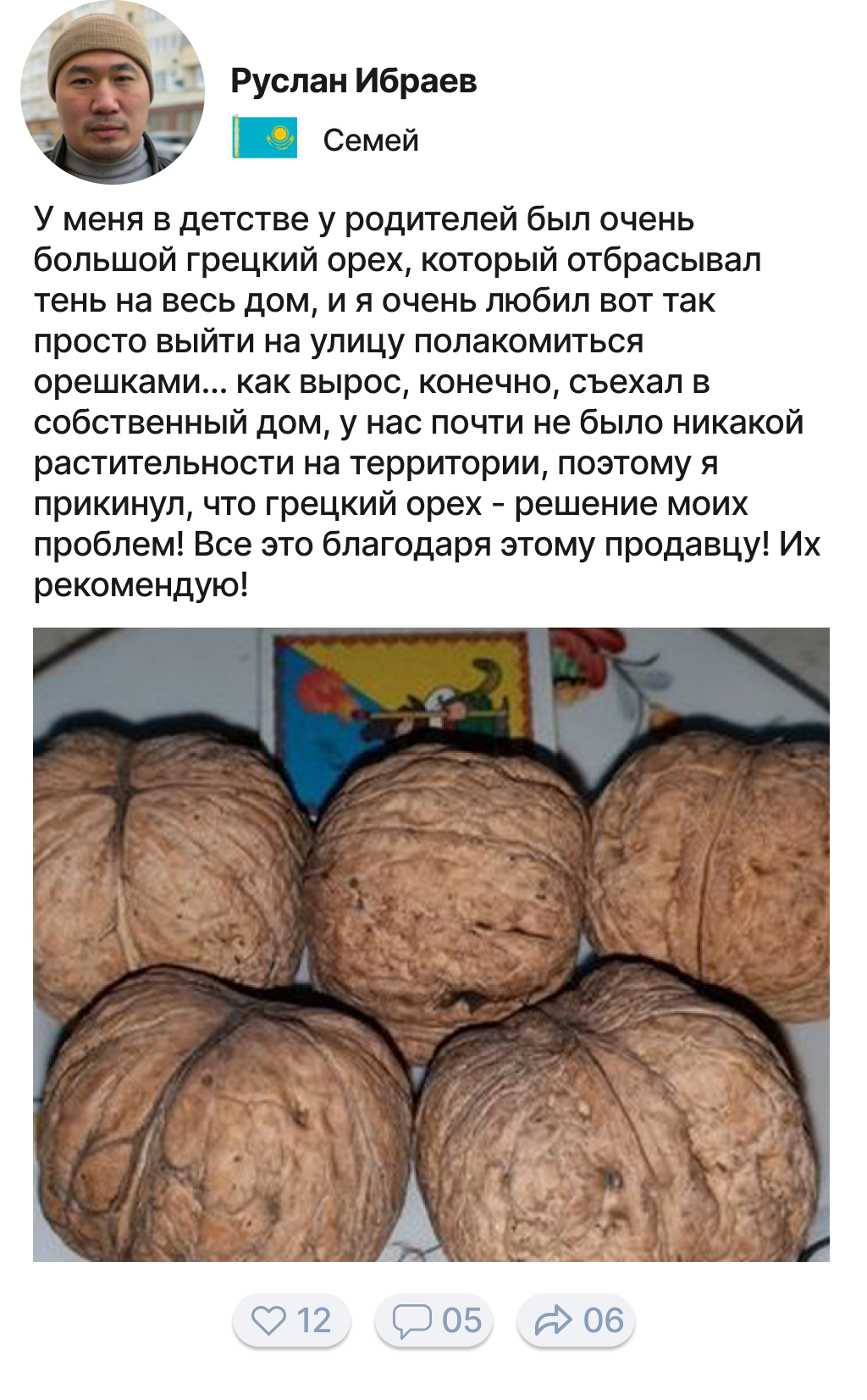 Грецкий орех — очень ценный вид дерева, и мы часто не понимаем, что растет у нас под ногами, каким богатством мы обладаем. Грецкий орех очень часто используют в производстве дорогой мебели, орех имеет очень красивый цвет и структуру дерева. Я с семьей выращиваю орехи на продажу уже более 20 лет. 5 лет назад мы начали продавать ореховые саженцы нашим клиентам и каждый раз радуемся, когда им удается вырастить собственные ореховые сады!